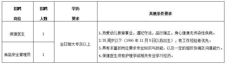 因学校工作需要,山西医科大学幼儿园面向社会招聘保健医生1名,食品安全管理员1名,用工形式采用劳务派遣制,现将有关事项公告如下: