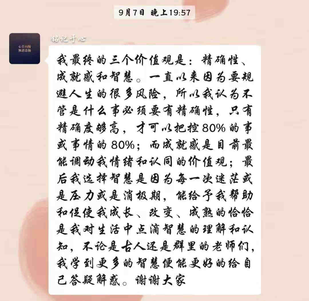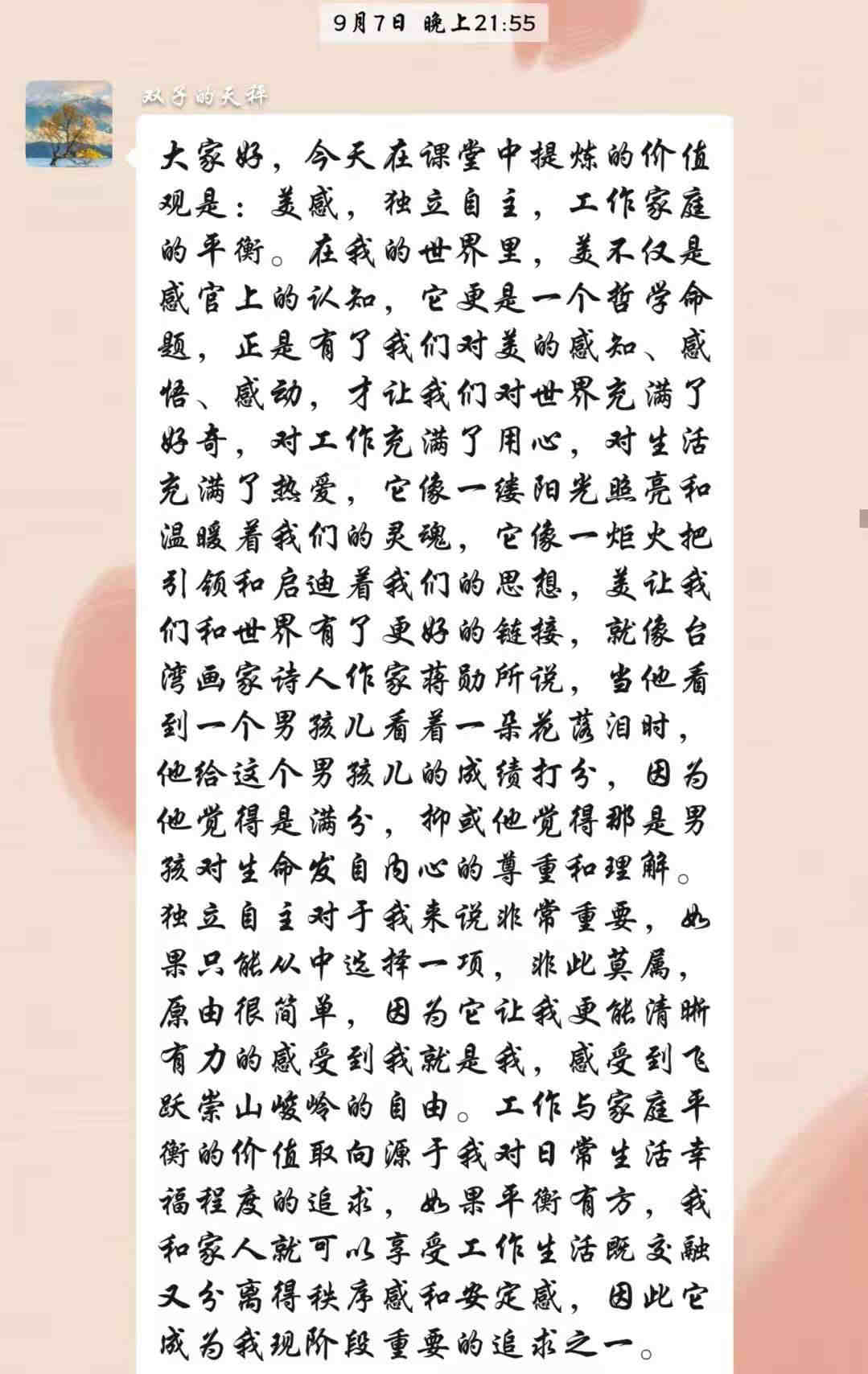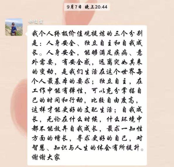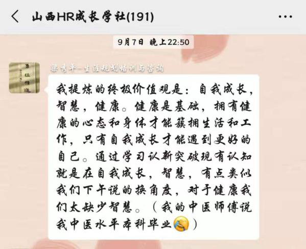 短暂的午间小憩后由明星学员杜春带领着大家跳了一曲“蹦沙卡拉”,满满的激情与能量,各位学员再次满血复活投入到了下午的课程当中。性格、兴趣、胜任能力都充分了解后,怎样才能走向职业巅峰呢?紧接着又一波测试来袭——价值观测试,36个价值观重视程度的选择,8个非常重视再次层层筛选,***后每位学员都得到了自己的3个******价值观,果然一千个人心中会有一千个哈姆雷特,大家互相分享着自己的选择,激烈的讨论着自己的******价值观,课后依然回味无穷。
