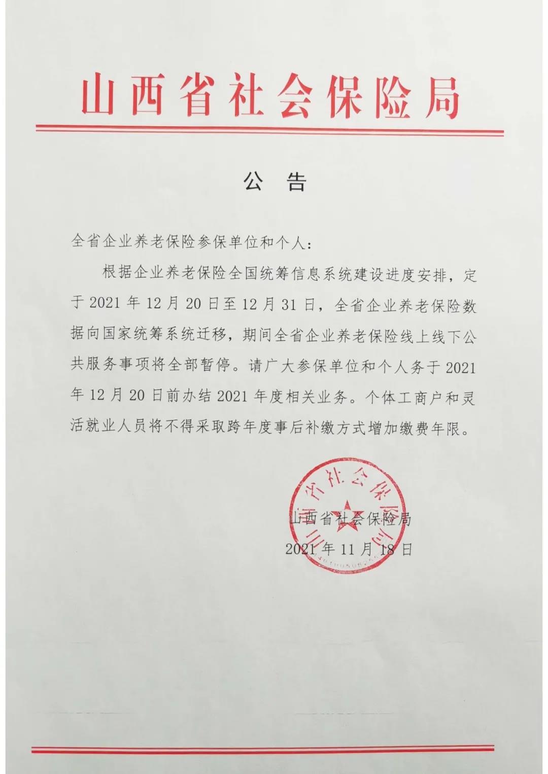 根据企业养老保险全国统筹信息系统建设进度安排,定于2021年12月20日至12月31日,全省企业养老保险数据向国家统筹系统迁移,期间全省企业养老保险线上线下公共服务事项将全部暂停。请广大参保单位和个人务于2021年12月20日前办结2021年度相关业务。个体工商户和灵活就业人员将不得采取跨年度事后补缴方式增加缴费年限。