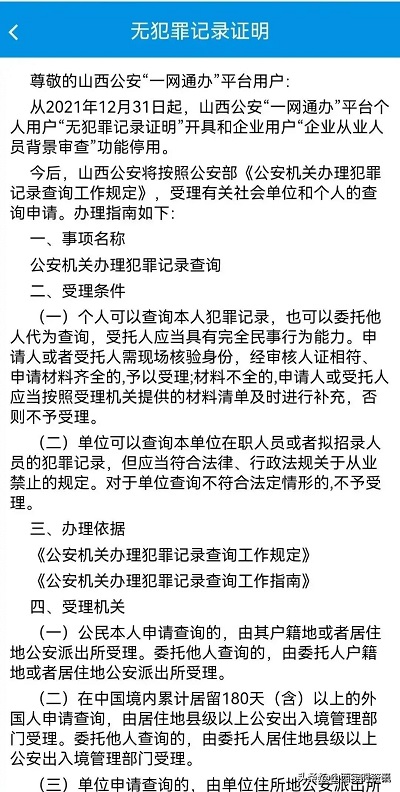 从2021年12月31起,平台个人用户“无犯罪记录证明”开具和企业用户“企业从业人员背景审查”功能停用。