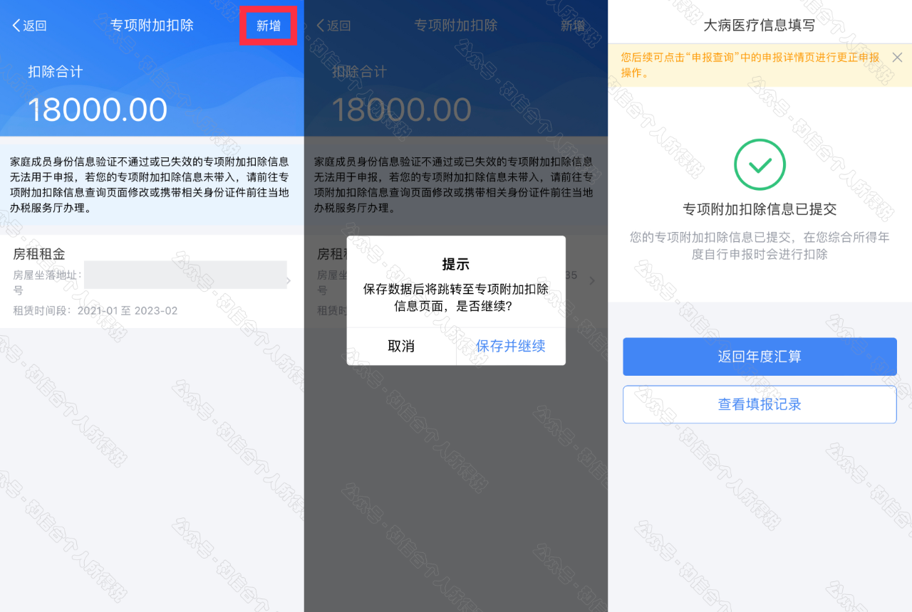 若您需要新增或修改专项附加扣除信息,可点击【新增】,跳转至采集界面后进行填报。填报完成后,可选择跳转回年度汇算继续填报。