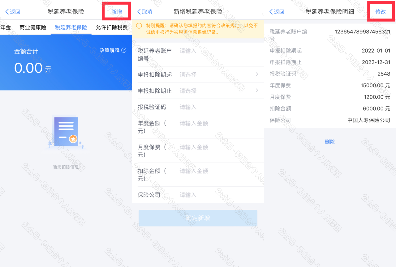 在其他扣除明细列表界面,您可点击【商业健康险】、【税收递延养老保险】页面,分别进行新增和修改。