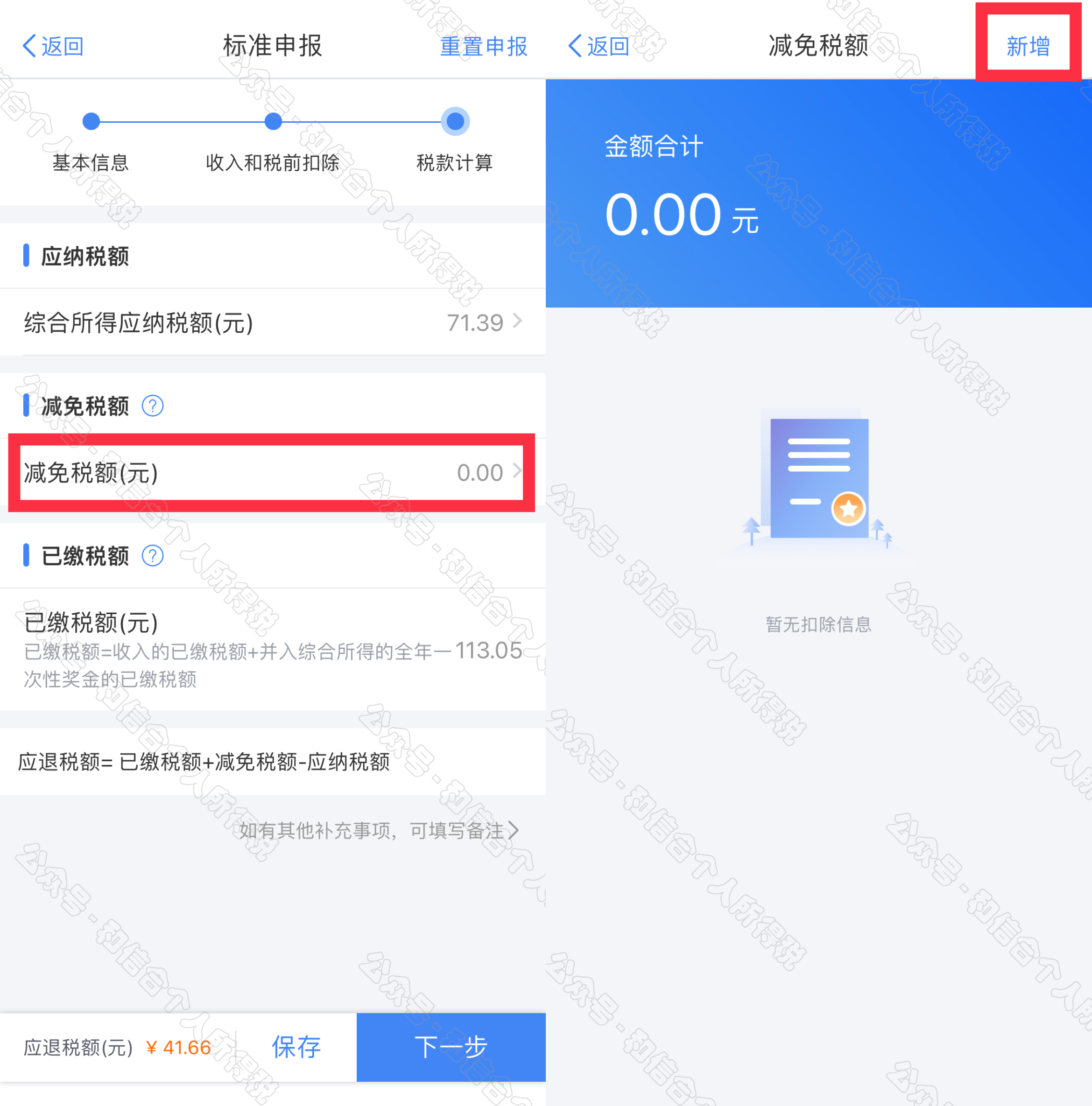 如您有减免税事项(残疾、孤老人员、烈属),可以点击【减免税额】新增相关信息。确认结果后,点击【提交申报】。