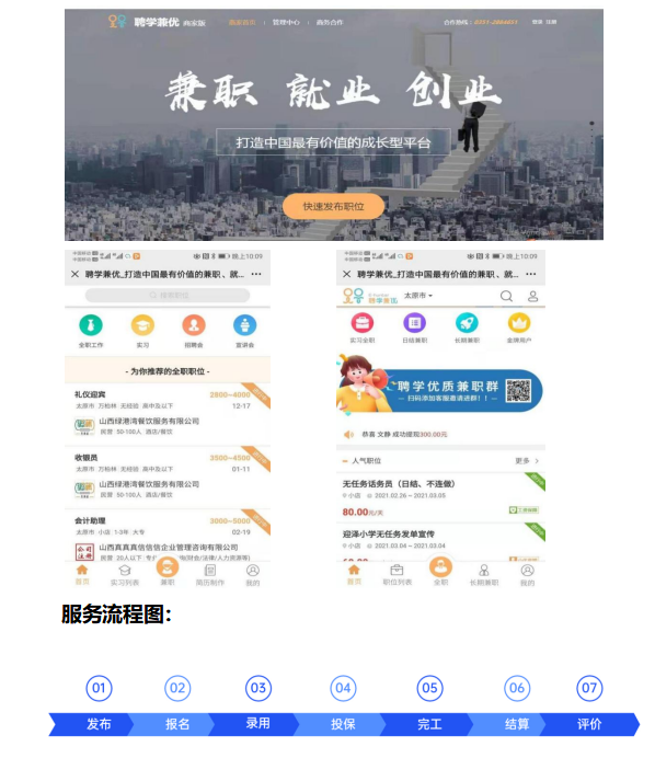 公司致力于打造山西灵活用工的领军企业、“山西酒店餐饮灵活用工******劳务品牌”,实现酒店服务员、房嫂的真派遣。目前公司“聘学兼优”灵活用工兼职平台注册兼职大学生有12万余人、社会兼职群体4万余人,是山西本土注册人数***多、兼职服务频次***勤、技术更新及时好用的灵活用工互联网平台。