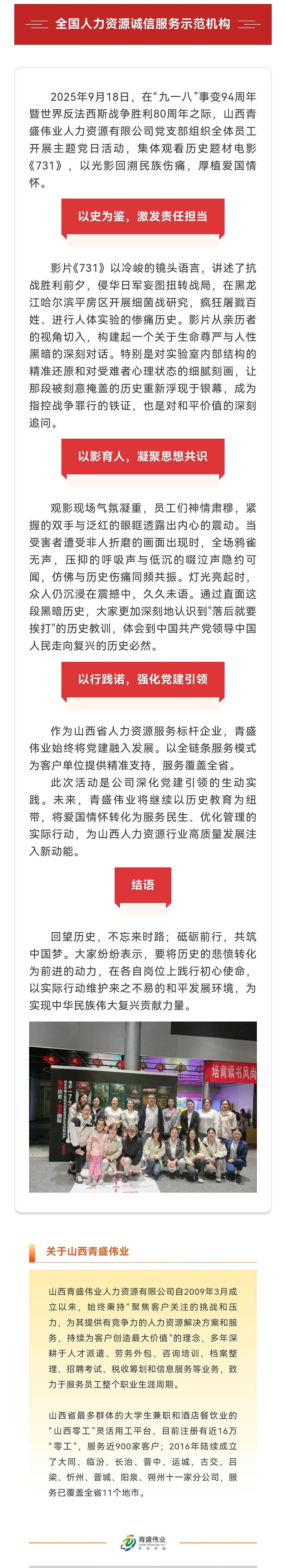铭记历史守初心党建引领担使命——山西青盛伟业人力资源有限公司开展“九一八”主题观影活动