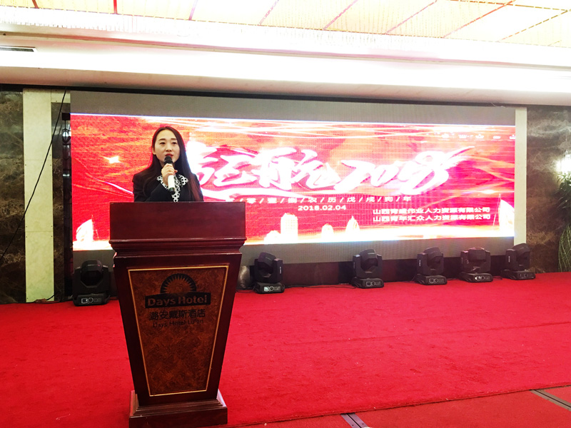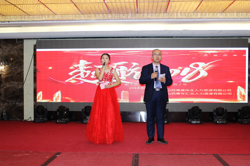 2018年2月4日16时,山西青盛伟业人力资源有限公司2018年年会暨第六期快乐会议在潞安戴斯酒店盛大开启。此次盛典以“走进新时代·培育新动能”为主题,回顾和盘点了2017,开启美好崭新的2018。公司全体员工,阳泉远中、忻州兴达、晋中尤复金、清徐汇盛、和顺华鹰、山西诺云等区域合作伙伴及员工家属欢聚一堂,共度联欢。