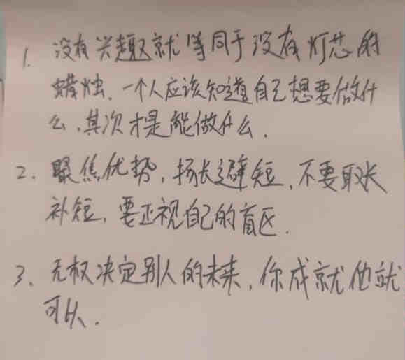 课程伊始,邓老师首先带领大家回顾了上一讲当中的自我盘点、职业周期与职业性向,通过确定优势让大家对自身有了更好的了解。兴趣是******的老师,在兴趣的天空了两位学员,讲述了自己***感兴趣的三件事,真实而又默契的发声引起阵阵掌声。