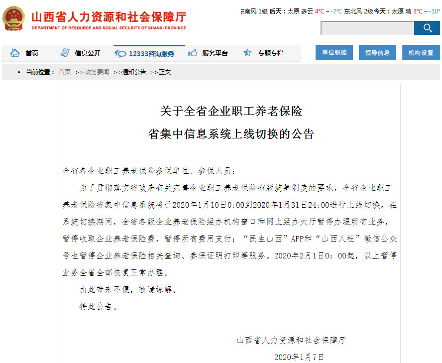 “民生山西”APP和“山西人社”微信公众号也暂停企业养老保险相关查询、参保证明打印等服务。
