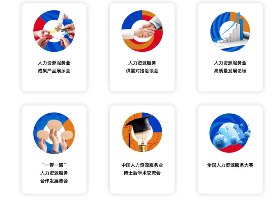 人力资源服务业成果产品展示会、人力资源服务供需对接洽谈会、人力资源服务业高质量发展论坛、“一带一路”人力资源服务业合作发展峰会、中国人力资源服务业博士后学术交流会、全国人力资源服务大赛。