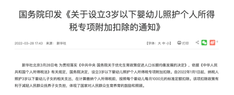 4、3岁以下婴幼儿照护个人所得税专项附加扣除自2022年1月1日起实施。