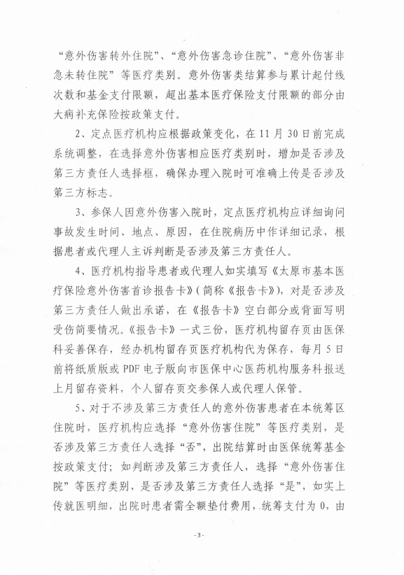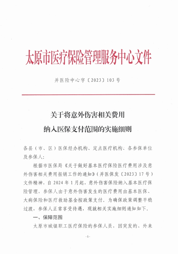 11月24日,从太原市医保中心传来消息,自2024年1月起,意外伤害保险纳入基本医疗保险管理,参保人由于意外伤害发生的医疗费用由基本医保、大病保险和医疗救助基金按政策支付。