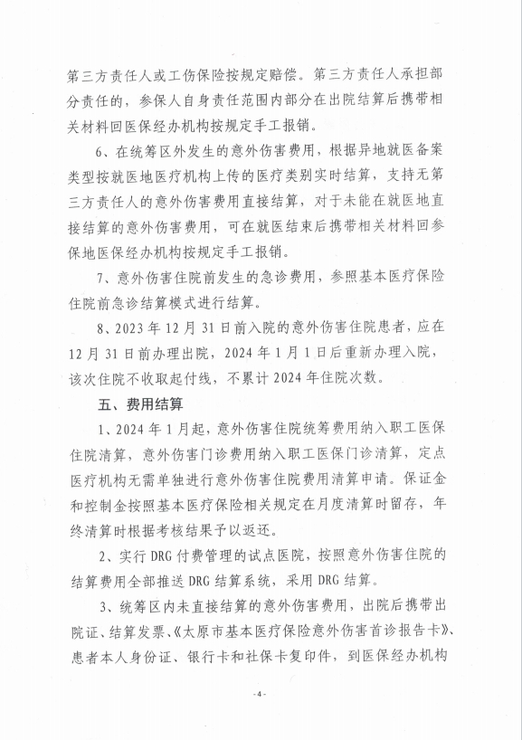 2023年12月31日前入院的意外伤害住院患者,应在12月31日前办理出院,2024年1月1日后重新办理入院,该次住院不收取起付线,不累计2024年住院次数。