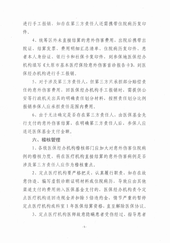 参保人因意外伤害入院时,定点医疗机构应详细询问事故发生时间、地点、原因,在住院病历中作详细记录,根据患者或代理人主诉判断是否涉及第三方责任人。